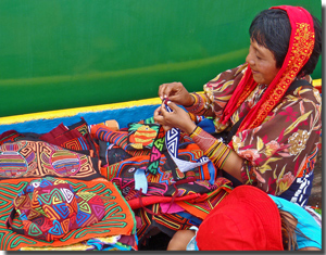 365 islands and atolls inhabited by the Kuna Indians. Primarily fishermen and caretakers of coconuts, they live very primitively in palm huts and dug out canoes for transportation. A matrilineal society, the women control the family finances and decisions. Best known for their molas, intricate and colorful fabrics hand sewn with depictions of stories and nature in their world.
