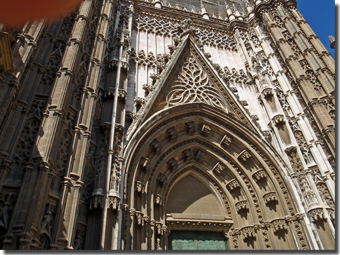 The majestic Cathedral of Seville with the Giraldi Tower was beautiful, one of the largest in the world. Originally a mosque, it became a Christian church and rebuilt to it's present Gothic state in 1507. The Patio de los Naranjas, or courtyard of oranges, was originally used by the Muslims for ablutions. La Giralda was the minarete of the mosque, constructed fo brick in 1184. Inside the tower is strictly a ramp, no stairs, so that the guards could ride up on horse back to ring the bells or call to prayer. The remain of Christopher Columbus himself are said to be buried here, or possibly his brother, the debate goes on.