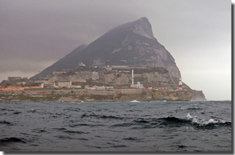 Approaching the Rock of Gibraltar we were suddenly confused by the sight on our radar. It looked as though 10 - 12 large container ships were heading our direction and far outside their shipping channel. No matter how we changed our course we couldn't seem to shake them. As we neared their position, we discovered they were all anchored in the windward side of the rock, each awaiting their turn to round Europa point and enter the bay for refueling. It was amazing to see them buck and roll as much as the next vessel when at anchor in a rough sea. With 30 knots of wind, confused seas, gray and rainy skies and a significant current we wove our way through them, rounded Europa point ourselves and sought refuge in the northern end of the bay at the Spanish anchorage.