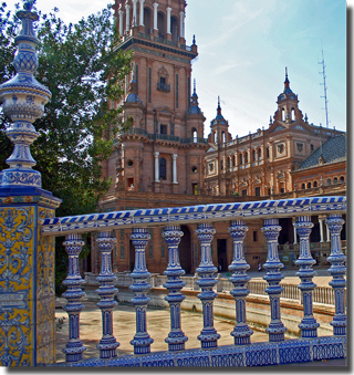 Each district of the town has a slightly different flavor of it's own. Whether walking the narrow and winding streets of Barrio de Santa Cruz or a leisurely stroll along the rivers edge, each is eqully enjoyable.The Plaza de Espana is a grand wide open display of their traditional architecture and their tile work. The distinctive gold and blue colors shine through everywhere. |