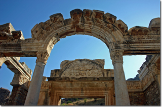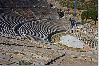 Grand Theater, 30 by 45 meters held a capacity of 25,000 people, used the elevation of Mount Panayir or Pion for it's structure. The hard marble and sound catching colonnade across the top of the theater proved fantastic acoustics that still ring true during the International Efes Festival each September. |