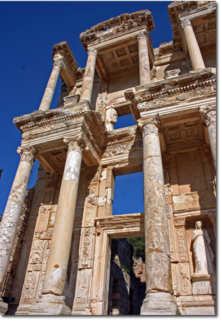 Library of Celsus, one of the most impressive structures still standing tall, once contained 12,000 scrolls and was designed with a special double paneled wall to protect the scroll from fire damage. There was only a small space left in which to build the library to the architects also designed it with lines to create an appearance of greater width.