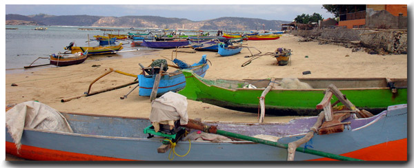 Colorful outriggers strewn across the beach each evening after a days work of fishing or tending the floating seaweed farms. Note the outboard motor mounted in the center that extends to the long arm with weed whacker style propeller on the end. An unmistakable sound that will be with us forever.