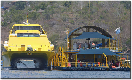 Ohana Kai enter the water way leading into Bali amongst jet ski's, para sailors, high flying rafts, and super tankers in numbers that we had never seen before. Surrounded by every type of water craft imaginable it is a wonder that we didn't drag in an extra crew member hanging from the spreaders. We then anchored with the big boys, monster sized container ships, for a night before entering the Bali Marina at Benoa Harbor the next day.