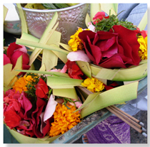 Primarily Hindu, they worship the same trinity of Brahma, Shiva and Vishnu as India but unlike them you will rarely see the figures in shrines. The sweet smelling and lovely offerings though are omnipresent on every door step, bemo, road, scooter - anywhere one can be set down or hung.