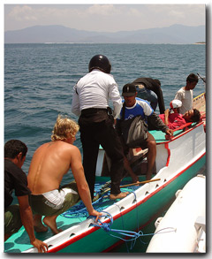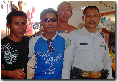 It was here that all the boats were boarded by officials, complete with motorcycle helmets. Quite a site to see out on the ocean. After much negotiation and some rupiah we were given permission to stay and enjoy their bay. The sweet and innocent Kelly's even had their paper work confiscated for a short time.